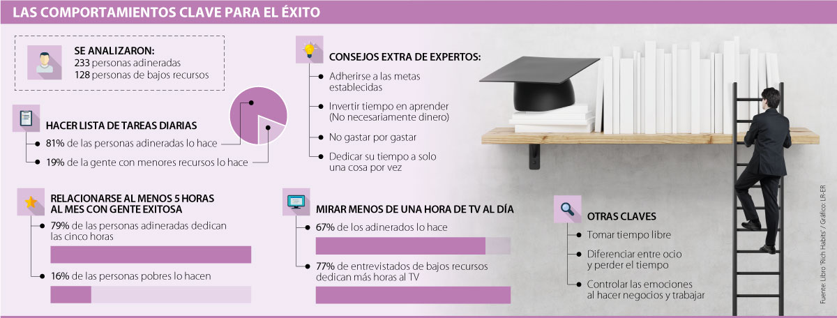 Una investigación realizada por el planificador financiero certificado Tom Corley, quien pasó tres años entrevistando a 233 personas adineradas y 128 personas de bajos recursos para descubrir la diferencia en las perspectivas, demostró que la gente exitosa financieramente tiene hábitos en común que los hacen más productivos, resultado que comparte en su libro ‘Rich Habits: The Daily Success Habits of Wealthy Individuals’.