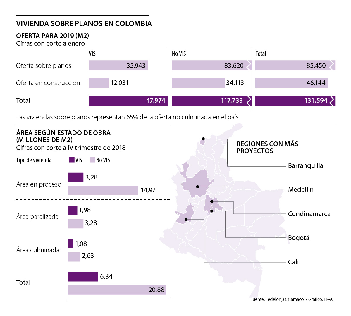 De acuerdo con datos de la coordenada urbana de Camacol, la oferta de vivienda en preventa con corte a enero de 2019 incluyó 131.594 metros cuadrados en todo el país, de los cuales 65% se enfoca en vivienda sobre planos y 35% en proyectos en construcción.
