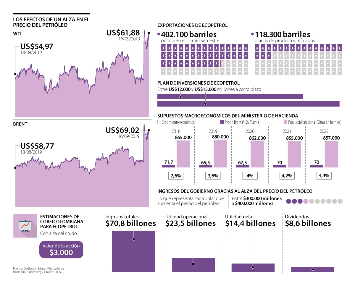 Los cálculos que realizó Corficolombiana señalan que dado caso de que el precio del petróleo continúe por arriba de US$65, los ingresos totales de la petrolera llegarían a $70,8 billones. Esta cifra implicaría un alza de 4,4%, en comparación con los $67,8 billones en ventas que alcanzó la empresa al cierre de 2018.