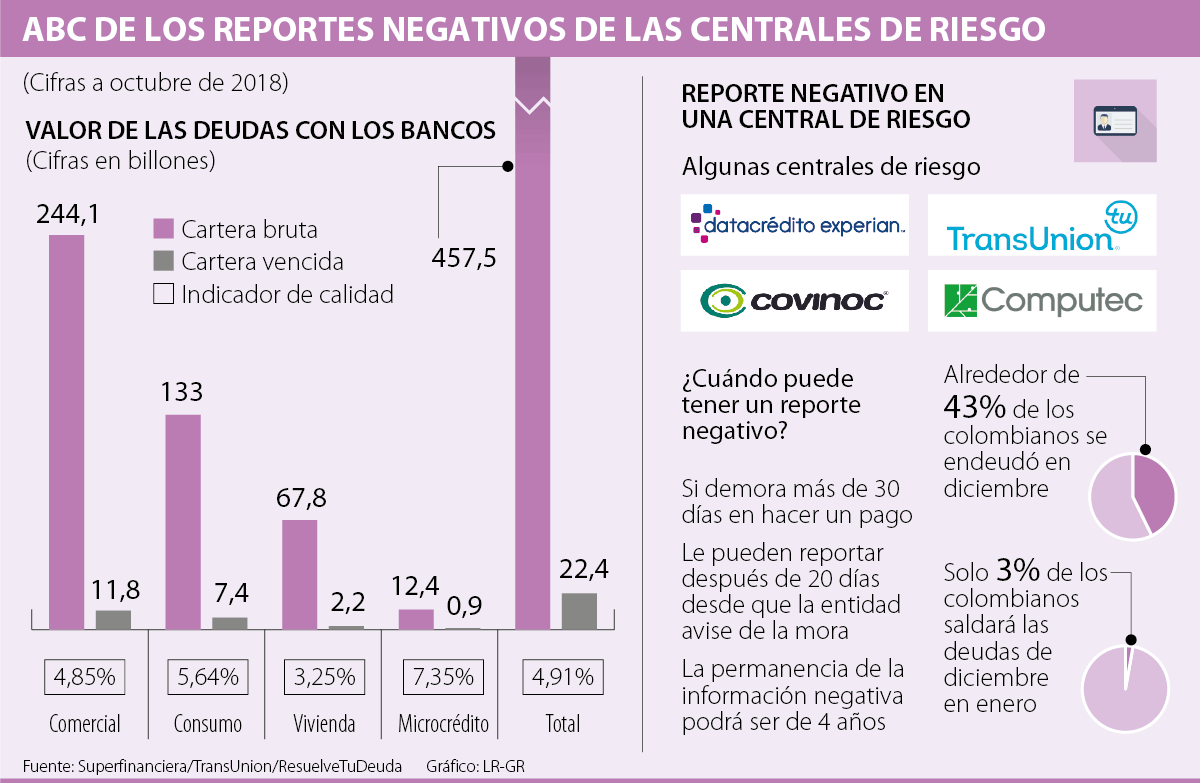 Si en las pasadas fiestas decembrinas abusó de su tarjeta de crédito para la compra de regalos o para salir de vacaciones, el riesgo de caer en mora en los próximos meses podría incrementarse. Y es que si se ‘cuelga’ con las cuotas y no logra salir a tiempo de sus deudas, las centrales de riesgo le podrían generar un reporte negativo que le impediría acceder a dinero prestado en el futuro.