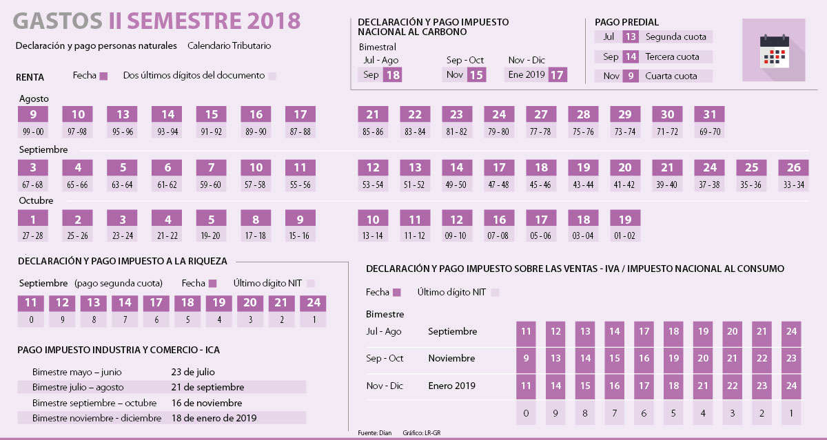 Un punto clave es el del calendario tributario que registra pagos de renta, activos en el exterior, declaración y pago del impuesto a la riqueza y del IVA, retención en la fuente, impuesto nacional al consumo, impuesto a la gasolina y al Acpm, impuesto nacional al carbono, predial, el tributo de Industria y Comercio (ICA). A este se le suman obligaciones importantes como las matrículas de colegios calendario B y las pensiones de instituciones calendario A.