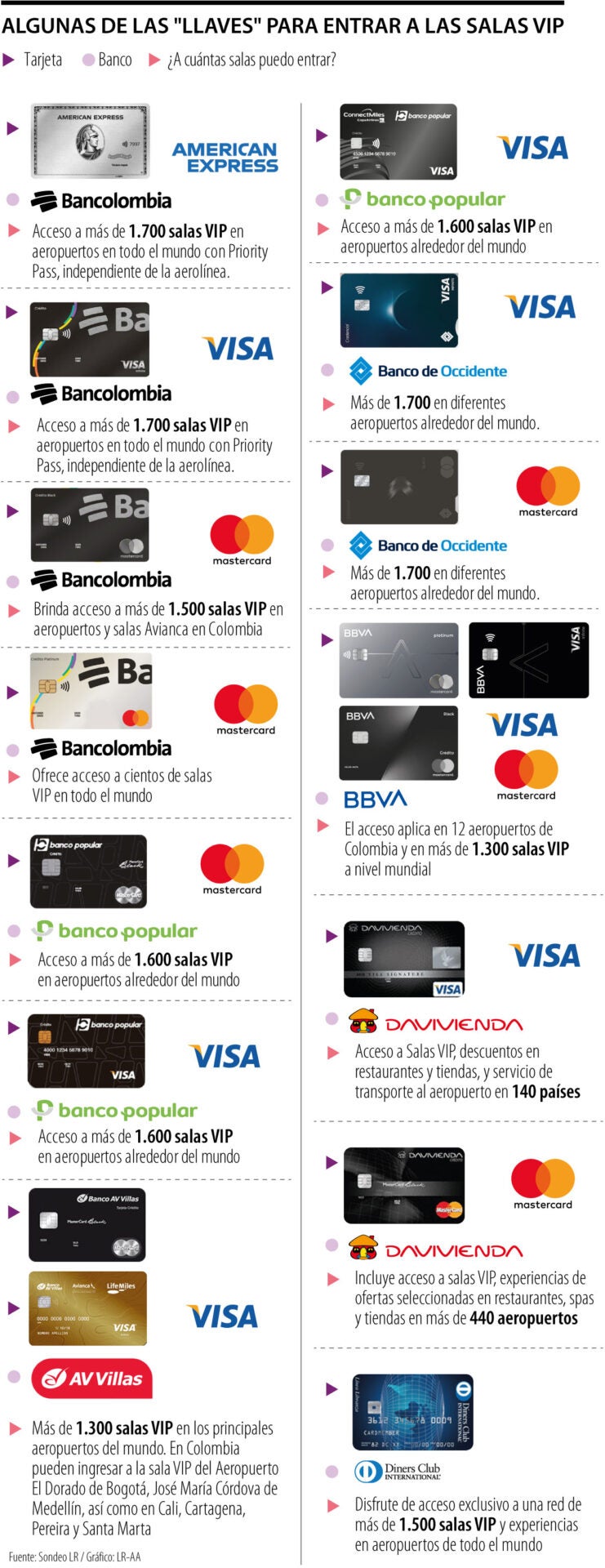 En el Banco Bbva, las tarjetas Platinum, Black e Infinite, tanto de Visa y Mastercard, permiten el acceso a los espacios de relajación en las 12 terminales del país. Para esta nota, se le consultó por información al banco Davivienda por sus plásticos que den acceso a salas VIP, pero no se obtuvo una respuesta.