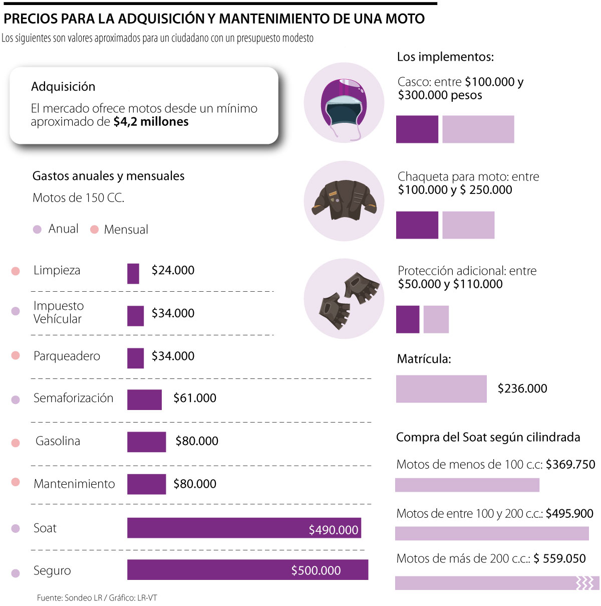 El Seguro Obligatorio de Accidentes de Tránsito (Soat) también es un gasto que debe asumirse cada año y el pago está relacionado con el cilindraje. En motos de menos de 100 centímetros cúbicos (c.c.) se debe asumir un pago de $369.750; en caso de que la unidad este entre los 100 c.c. y 200 c.c. se debe pagar $495.900; y, por último, los propietarios de motos de cilindraje superior a 200 c.c deben asumir $559.050.