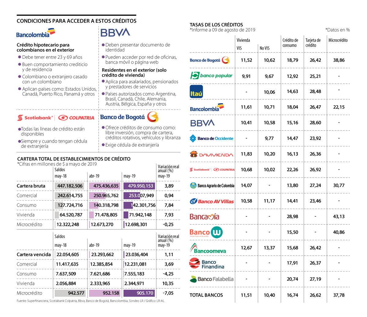 En el más reciente informe de operaciones de la Superfinanciera, con cifras a mayo de 2019, se dio a conocer el comportamiento de la cartera total de los establecimientos de crédito. La cartera bruta tuvo una variación real anual de 3,89% presentando una cifra de $479,9 billones, y al segmentar por tipo de cartera, la comercial varió 0,94%, la de consumo 7,84%, vivienda 7,93% y microcrédito -0,25%. Al pasar a cartera vencida, con una variación de 1,11%, la que tuvo mejor comportamiento fue vivienda con un crecimiento de 10,35%, y comercial, con 3,94%.