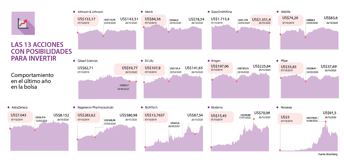 Las caídas en los últimos meses están entre -8,7% para el caso de Johnson y Johnson; -5,7% en Merck; -17,6% de GlaxoSmithKline; -18,9% para la acción de AbbVie; -25,7% la de Gilead; Eli Lilly (-18%); Amgen (-15%), Pfizer (-7,9%), y Regeneron Pharmaceuticals (-14,7%), por lo que los analistas señalan que la recuperación podría ser de similar tamaño a medida que avancen sus estudios.