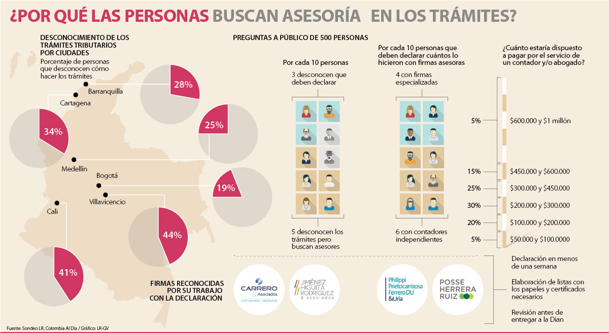 Los colombianos siempre van a necesitar ayuda profesional para tener lista su declaración de renta. De hecho, en un sondeo realizado en junio de 2016, la consultora Colombia al Día evidenció que por cada 10 personas que deben declarar, cinco no tienen claros los trámites a realizar, y tres no saben con seguridad si deben cumplir esa obligación.