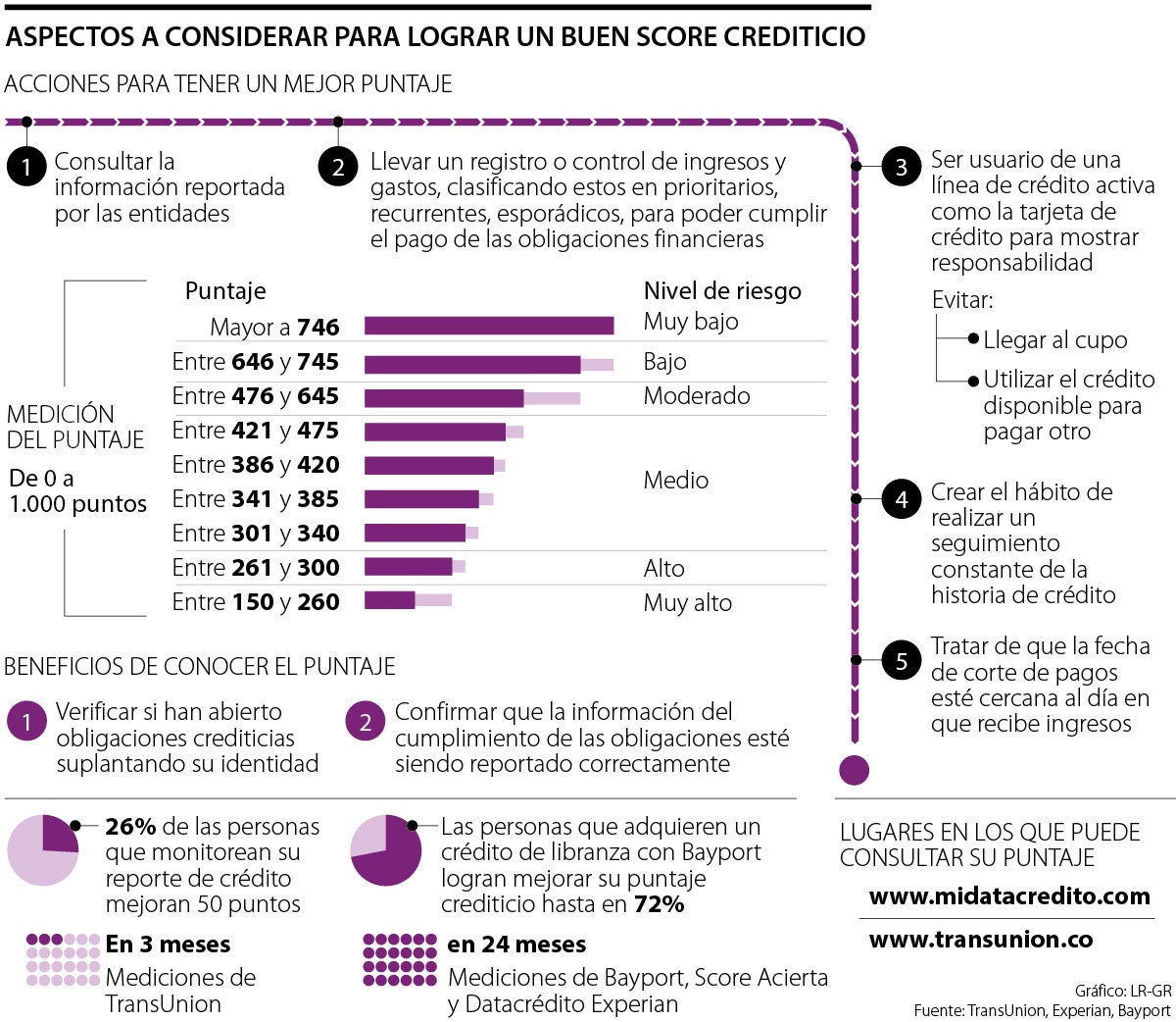 Desde la óptica de la banca, quienes son los que presentan los reportes y analizan el puntaje, el gerente de riesgo de crédito del Banco de Occidente, Leonardo Caycedo, coincide en que la principal recomendación para que un cliente tenga un buen score es mantener un endeudamiento acorde con sus ingresos y su capacidad de pago, y que en caso de una eventualidad, “no deje vencer la obligación o esperar la llamada de cobro, sino contactar proactivamente a la entidad y evaluar conjuntamente alternativas de pago que permitan cumplir adecuadamente. Si la persona ya se encuentra en mora, dar prioridad al pago, con lo cual en el corto plazo se puede ver una mejoría en el puntaje”, indicó Caycedo.