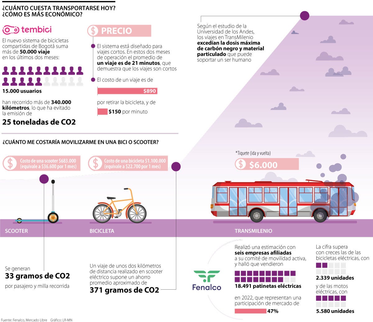 El sistema está diseñado para viajes cortos. En dos meses de operación, según dijeron a LR, el promedio de un viaje es de 21 minutos, que demuestra que los recorridos son cortos. Se está solucionando primera y última milla. El costo de un viaje es de $890 por retirar la bicicleta, y a ese total se le suma el valor de $150 por minuto. Esto, comparado con un viaje de $3.000 ($6.000 por día) por trayecto en Transmilenio, que, por día, al mes, significa $180.000; al año: $2,2 millones.