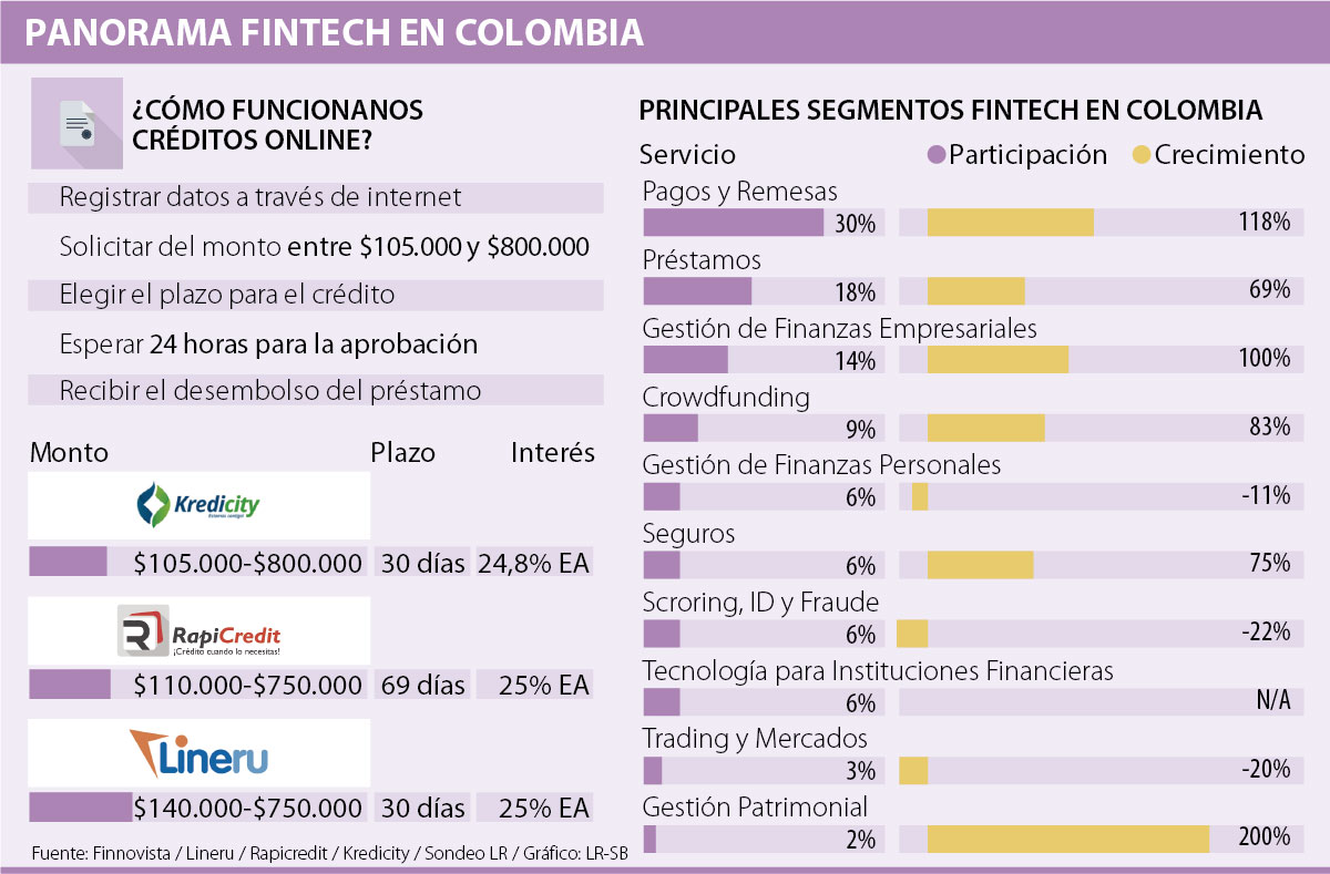Algunos ejemplos de este tipo de Fintech son Lineru, un servicio que facilita créditos hasta por 30 días, entre $140.000 y $750.000, con tasas de interés de 25% efectivo anual (EA); RapiCredit, que también maneja esta tasa de interés, con plazos hasta 69 días para préstamos desde $110.000 hasta $750.000, o Kredicity, que maneja montos entre $105.000 y $800.000 con intereses de 24,8% EA hasta por 30 días.