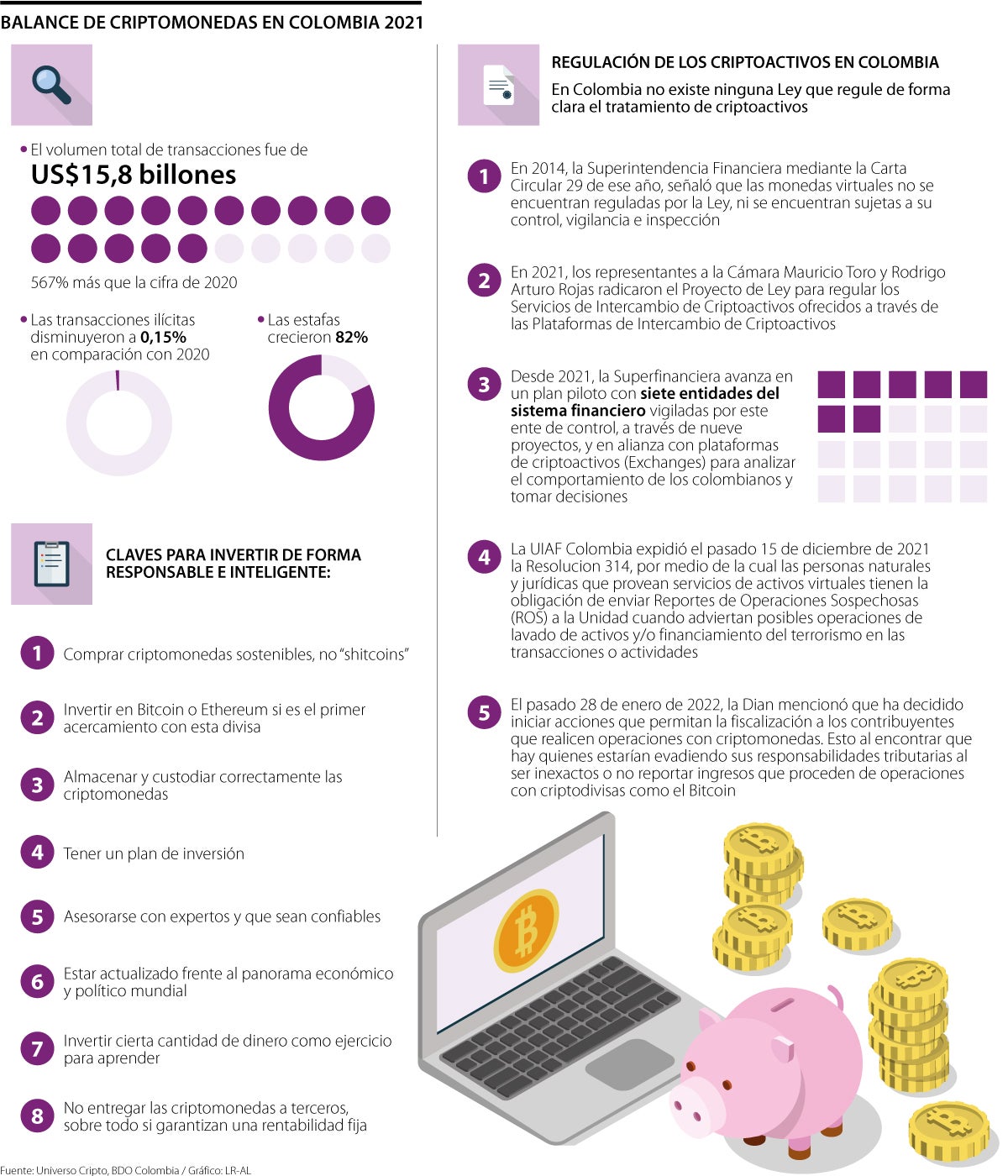Aunque las criptomonedas no tienen una naturaleza jurídica legal definida, y el Banco de La República ha declarado que no son efectivo, no son dinero, no son un medio de pago y no son divisa, Tatiana Sierra, gerente de Impuestos de BDO Colombia advirtió que “la Dian las ha entendido como un activo inmaterial o intangible, susceptible de ser valorado y que puede generar una renta y hacer parte del patrimonio del contribuyente”. Por esta razón, la Superfinanciera avanza en un plan piloto con la finalidad de que, a través de los bancos y las plataformas digitales, se puedan realizar operaciones de retiro y depósito de las mismas.