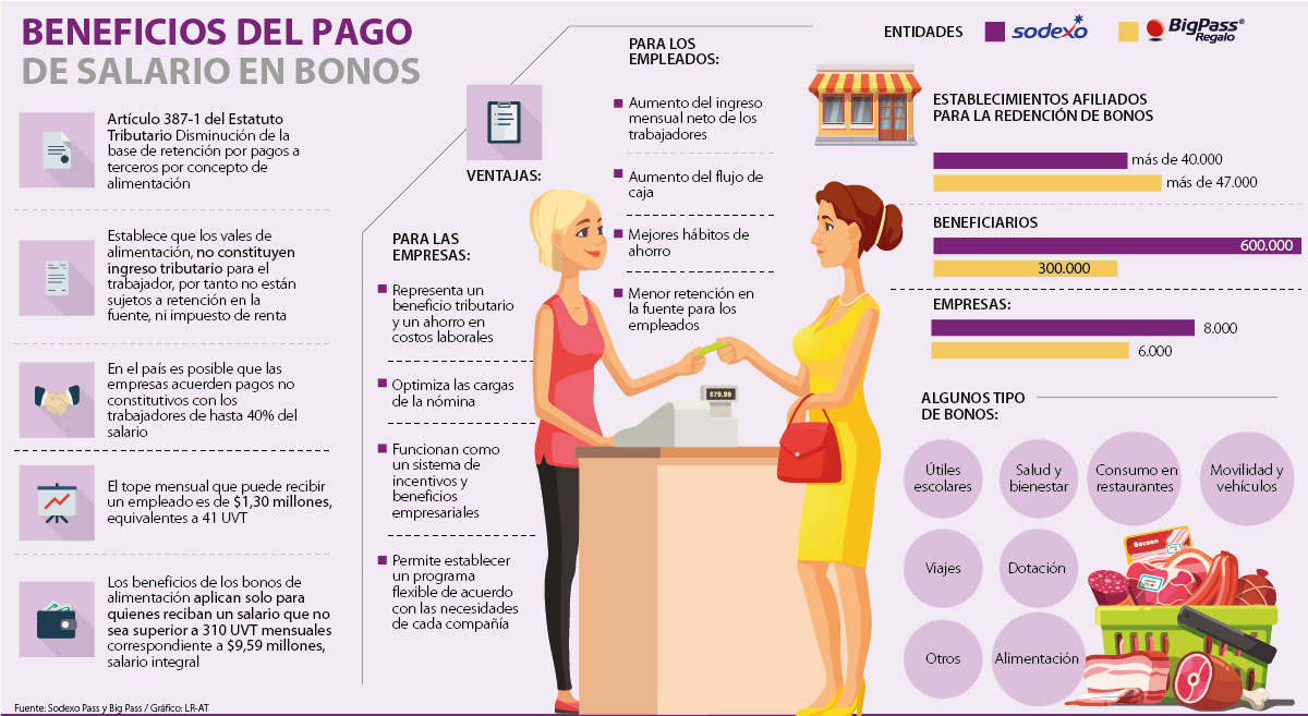 En Colombia existe una alternativa de pagos a los trabajadores que flexibiliza la forma en que las compañías distribuyen la nómina y que cada vez es más popular: los bonos. Por medio de empresas como Sodexo o Big Pass Edenred, especializadas en tercerizar pagos que no se constituyen como ingresos, los trabajadores reciben diferentes beneficios por medio de chequeras o tarjetas que pueden canjear en más de 50.000 establecimientos aliados y que se convierten en un ingreso adicional al salario.