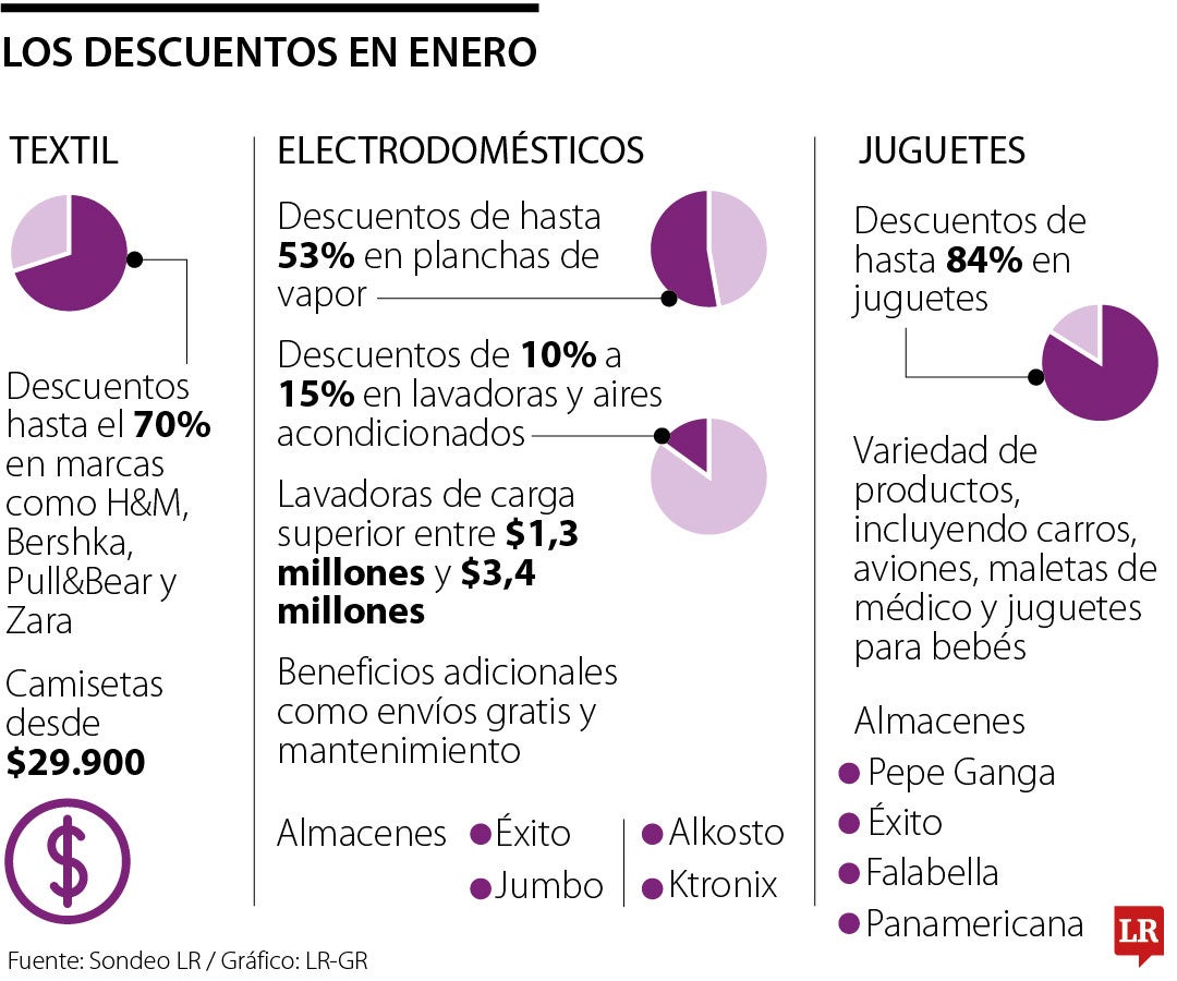 Los juguetes son los productos que actualmente ofrecen los mayores descuentos, con tiendas como Pepe Ganga, Éxito y otras del sector aprovechando los stocks de diciembre. Estas tiendas lanzaron promociones de hasta 84% de descuento en enero con una amplia variedad de artículos.