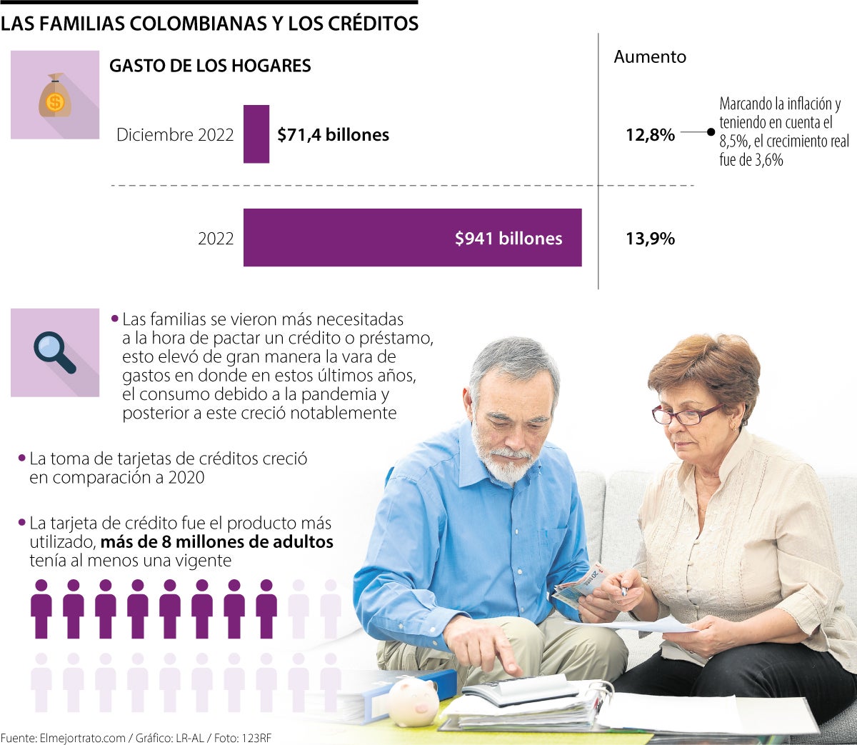 Un estudio desarrollado por ElMejorTrato.com, sitio especializado en la comparación de productos financieros para particulares, indica que cada vez más familias colombianas piden créditos para cubrir sus gastos y necesidades básicas, un fenómeno que estaría respondiendo principalmente al aumento del gasto en los hogares.