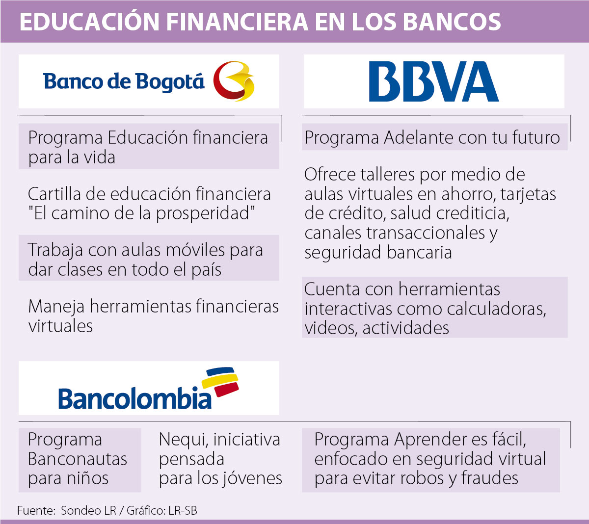 El Banco de Bogotá también hace este tipo de estrategias. Por ejemplo, a través de su programa Educación financiera para la vida, enseña a las personas a usar de forma responsable diferentes instrumentos financieros, con el fin de evitar altos niveles de endeudamiento o morosidad.