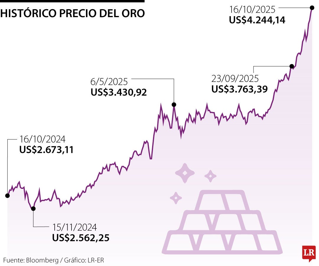 En cuanto al oro, pasó de la barrera de US$4.000 por primera vez el lunes 13 de octubre. La cotización internacional actual ya ronda US$4.200 y analistas vaticinan que el rally podría escalar incluso hasta US$5.000.