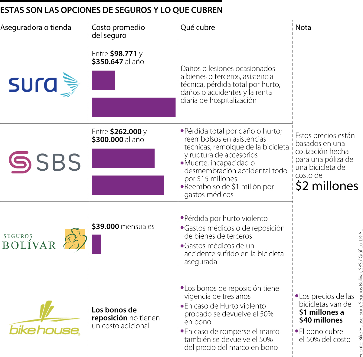 Simulando la compra de una bicicleta nueva en Bogotá por un valor aproximado de $2 millones, Sura ofrece planes desde $98.771 hasta $$350.000 al año. Este último cubre daños o lesiones ocasionados a bienes o a terceros, reembolso de los costos de asistencia técnica, devolución total del costo por pérdida por hurto violento, daños o accidentes con un deducible de 30% y la renta diaria de hospitalización.