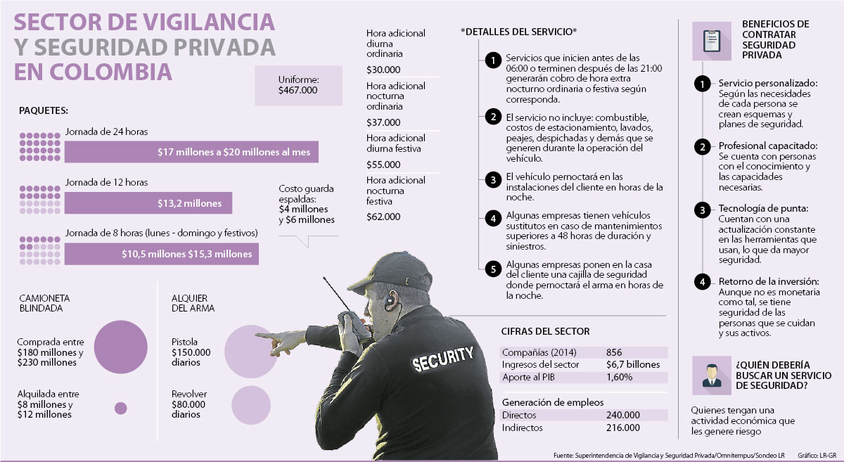 Por otro lado, para una jornada de 24 horas las compañías de seguridad ofrecen paquetes que están alrededor de $15 millones a los $20 millones mensuales, pues debe haber varias personas que trabajen por turnos e incluye la asignación de una camioneta.