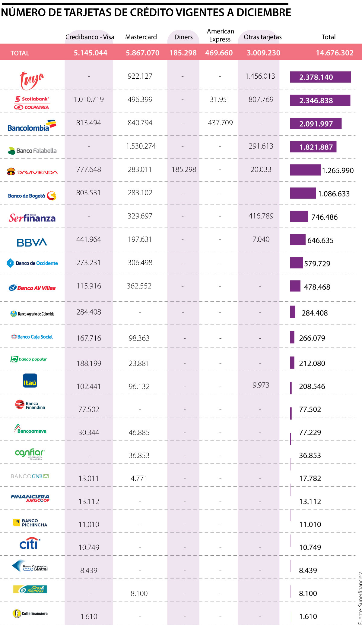 En Colombia hay más de 14,76 millones de tarjetas de crédito vigentes, según datos de la Superintendencia Financiera a diciembre, y el mercado lo lideran Tuya y Scotiabank Colpatria con 2,37 y 2,34 millones de plásticos activos. En el top cinco le siguen entidades como Bancolombia, Banco Falabella y Davivienda.