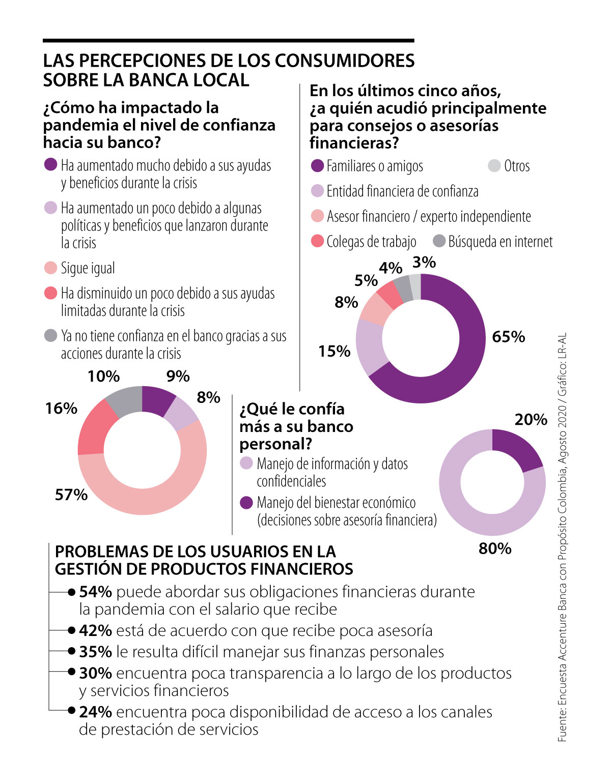 Las cuentas de los hogares colombianos han sido unas de las más afectadas por la crisis económica desatada por el covid-19. Esto se evidencia en que cinco de cada 10 consumidores han podido abordar sus obligaciones financieras durante la pandemia con el salario que reciben, mientras que los otros han acudido a ahorros, préstamos, entre otras opciones, detalló Accenture en el reporte ‘Banca con propósito’.