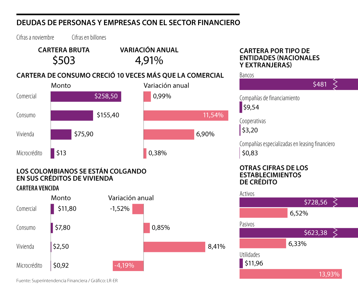 Al consolidar la cartera bruta, que contempla todas la emisión de créditos de las entidades financieras a personas y empresas para cualquier destinación, el índice aumentó 4,91% y se ubicó en $503 billones.