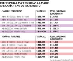 Es decir, en el caso de una camioneta de nueve años de antigüedad y de menos de 1.500 c.c, cuyo Soat cuesta aproximadamente $653.500, tendría un aumento de $76.459 con el incremento del 11,7%. Para las camionetas de más de 2.500 c.c, que actualmente tienen un precio del Soat de $915.200, tendrían un aumento de $107.078.