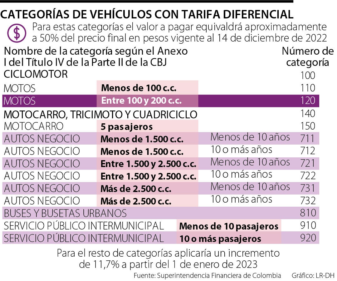 Cabe aclarar que el Gobierno Nacional anunció que brindaría un descuento de 50% para 14 categorías de vehículos definidas en el artículo 1 del Decreto 2497 de 2022. Entre estas se encuentran ciclomotor; motos de 100 c.c. y de entre 100 y 200 c.c.; motocarro, tricimoto y cuatriciclo; autos de negocio; buses y busetas urbanos; y vehículos del servicio público intermunicipal.