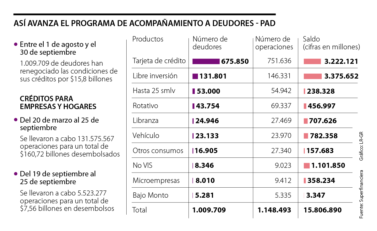 Mediante el Programa de Acompañamiento a Deudores (PAD), el cual fue dado a conocer por la Superintendencia Financiera de Colombia y que entró en vigencia desde el 1 de agosto, más de un millón de deudores refinanciaron sus créditos por un valor total de $15,8 billones al 30 de septiembre.