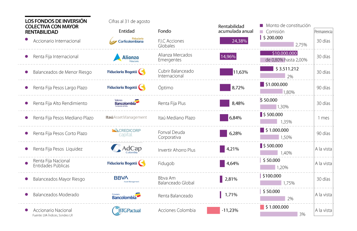 Con el propósito de conocer cuáles son los FIC por categorías para personas naturales que han generado las mayores rentabilidades en el último año, con corte al 31 de agosto, LR consultó a LVA Índices, la firma que administra la categorización de estos fondos.