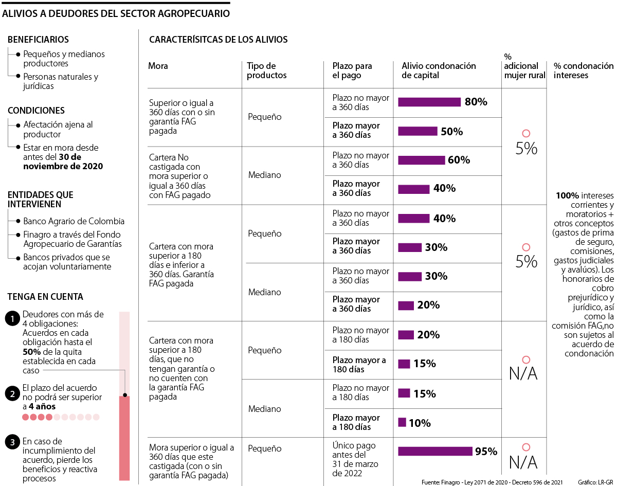 El Gobierno prevé que 250.000 productores que tienen en total 323.000 obligaciones por $1,1 billones en deudas vencidas, principalmente, con el Banco Agrario y Finagro, podrán obtener ayudas que conlleven a la cancelación de 100% de los intereses corrientes y de mora, además de quitas de hasta 80% para pequeños productores y 60% para medianos.