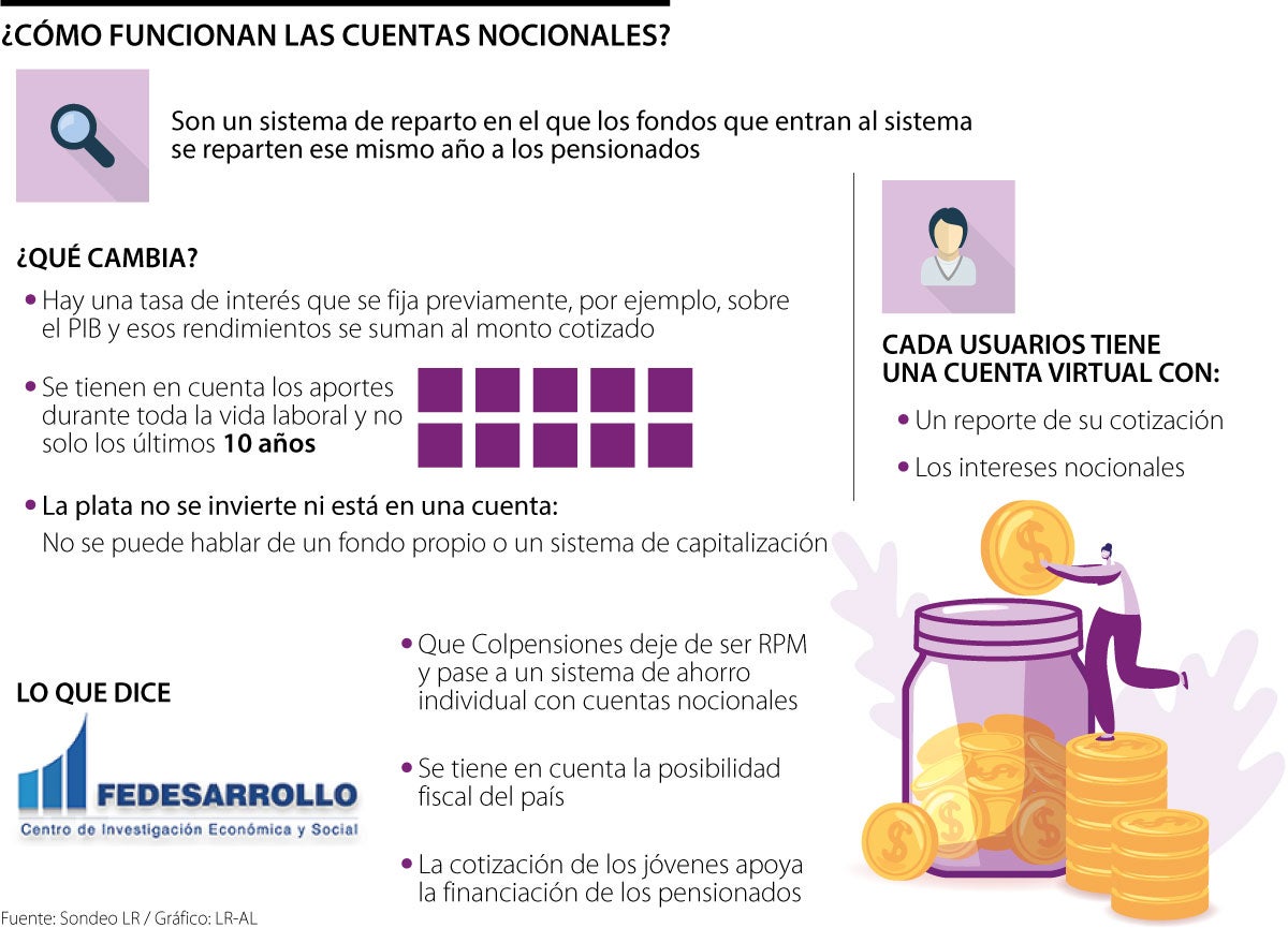 Según explica el docente de la Universidad de los Andes, Daniel Mantilla García, las cuentas nocionales son un sistema de reparto en el que la plata que entra al sistema se reparte el mismo año entre los pensionados, con una liquidación similar a la que se maneja en un sistema de ahorro.