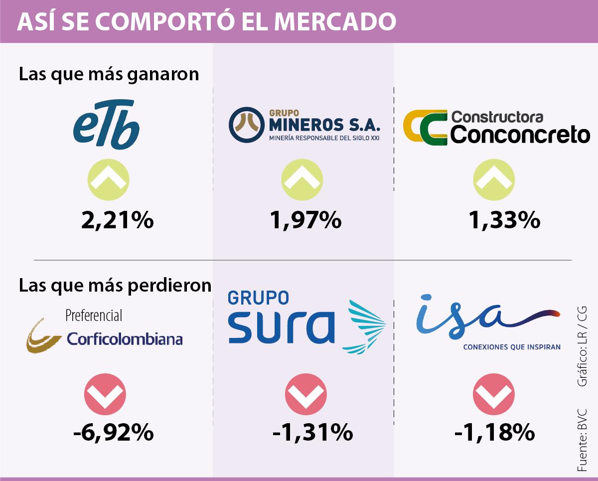 En cuanto a otras con alzas destacadas se registró el comportamiento de Mineros, que subió 1,97% quedando en $2.585 por acción; y de cerca estuvo Conconcreto, con 1,33% de crecimiento y $994 por papel.