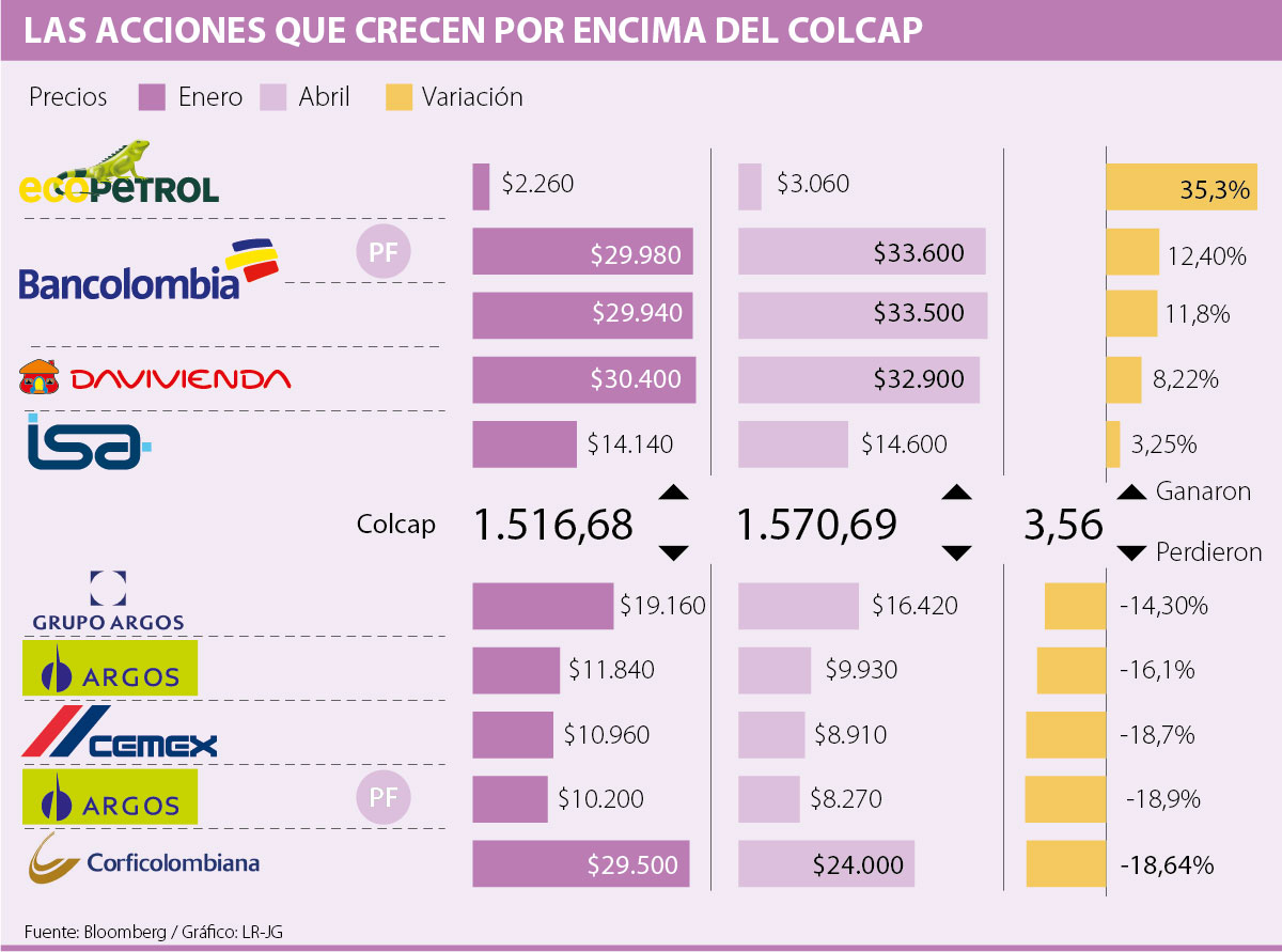 La que más ha crecido en su precio es Ecopetrol, que pasó de tener un valor de $2.260 el primero de enero a $3.060 al cierre de ayer, por lo que en casi cuatro meses los accionistas que apostaron por el título de la petrolera han ganado 35%.