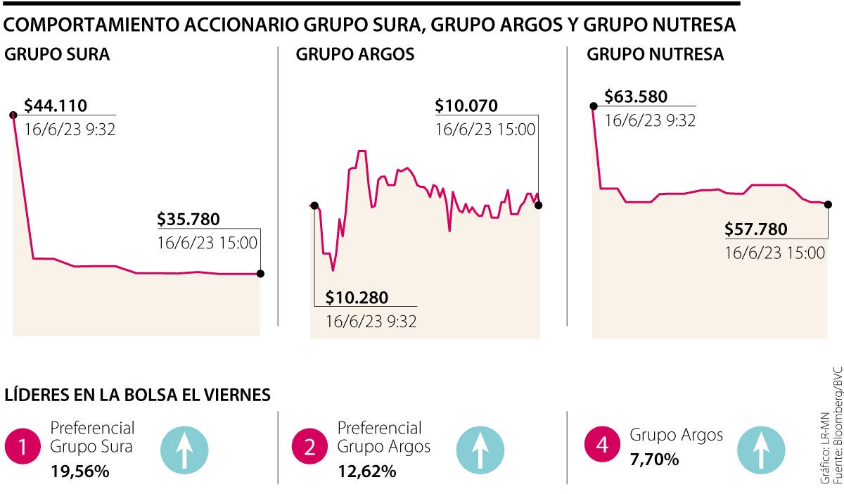 Justamente, la preferencial de Grupo Sura fue la acción que más creció en la jornada, pues tuvo un aumento de 19,56% cotizándose a $13.450, seguida de la preferencial de Grupo Argos que creció 12,62% a $6.070, y Grupo Argos, que ocupó el cuarto lugar y cerró cotizaciones a $10.070, con crecimiento de 7,70%.