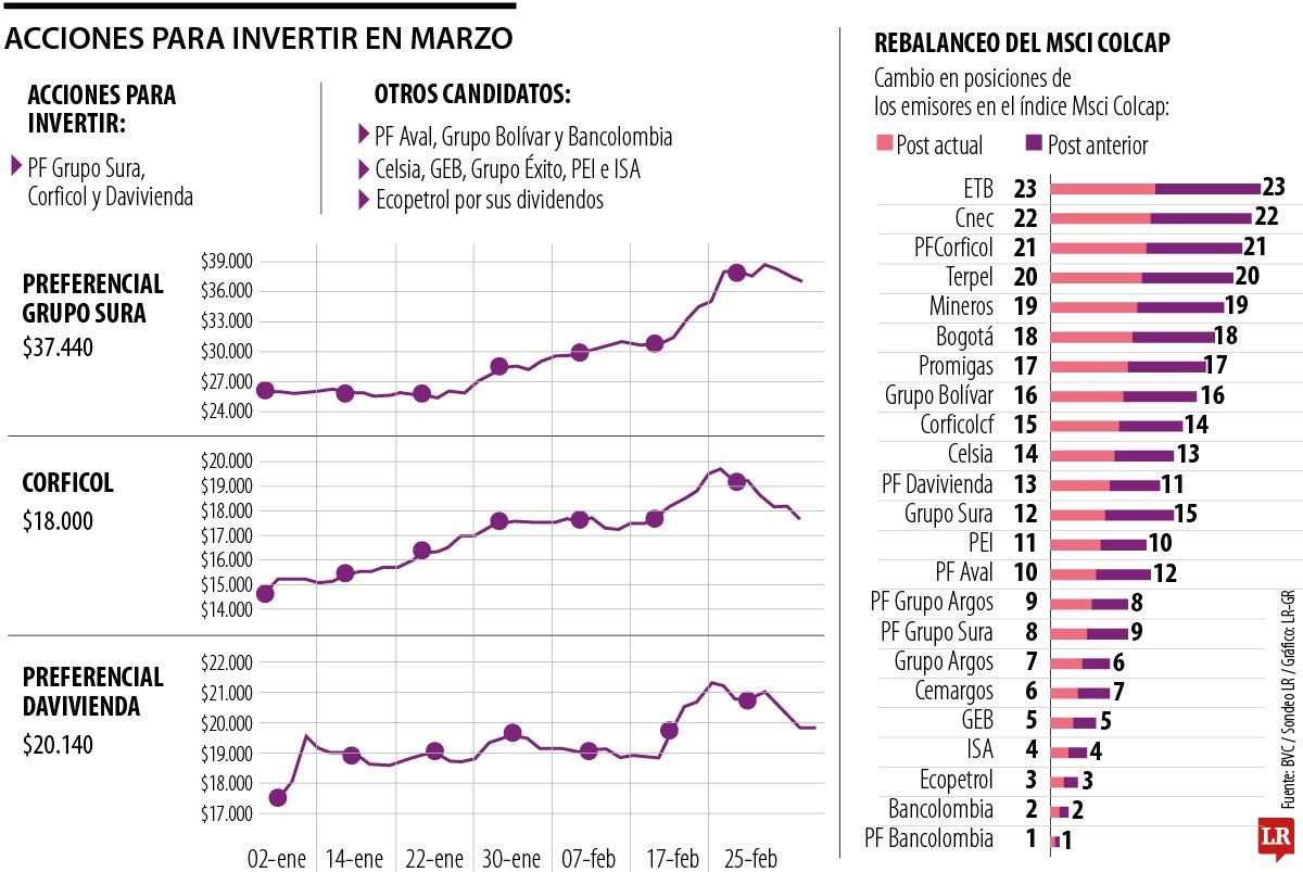 LR hizo un sondeo de las acciones a invertir para marzo y se encontró que la PF Grupo Sura, Corficol y Davivienda son las acciones que destacan para una posible inversión en este periodo de tiempo en la Bolsa de Valores.