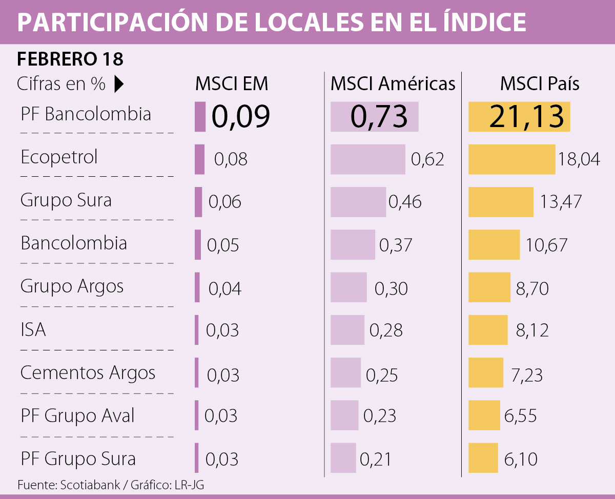 A pesar de los impactos de las nueve acciones que se mueven activamente, no existirían eliminaciones de títulos locales en el MCSI Emerging Markets, pero sí “una disminución de la participación de Colombia sobre el Market Cap, que pasaría de 0,44% a 0,35%”.