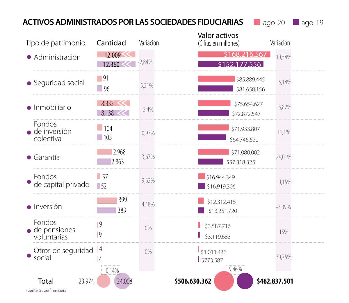 Las sociedades fiduciarias administraron activos por $506,63 billones, un máximo en el año, en 23.974 fiducias al cierre de agosto. El valor de los activos bajo administración (AUM, por sus siglas en inglés) aumentó 9,46% respecto al mismo periodo del año pasado, mientras que el número de fiducias disminuyó 0,14%.