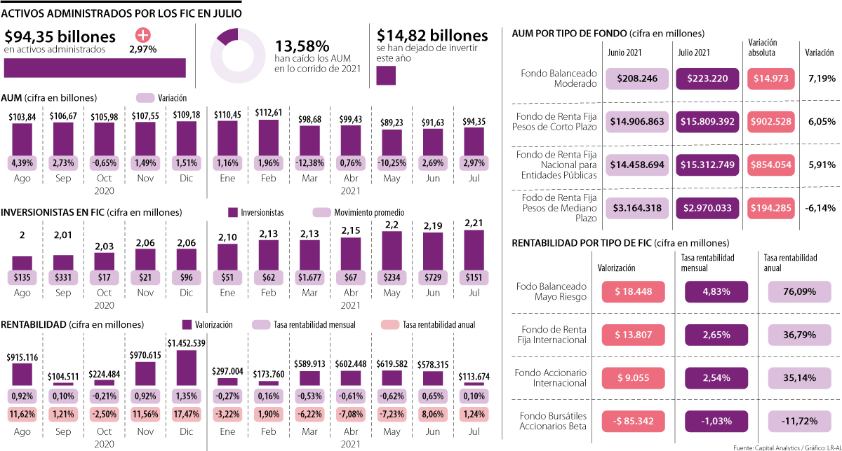 Con la economía y las inversiones recuperando su ritmo, al cierre de julio, los activos administrados (AUM por sus siglas en inglés) por los Fondos de Inversión Colectiva (FIC) aumentaron 2,97% a $94,35 billones; es decir, se percibió el ingreso de $2,71 billones más en dicho lapso. Sin embargo, en lo corrido del año, esta misma cifra ha caído cerca de $14,82 billones o -13,58%.