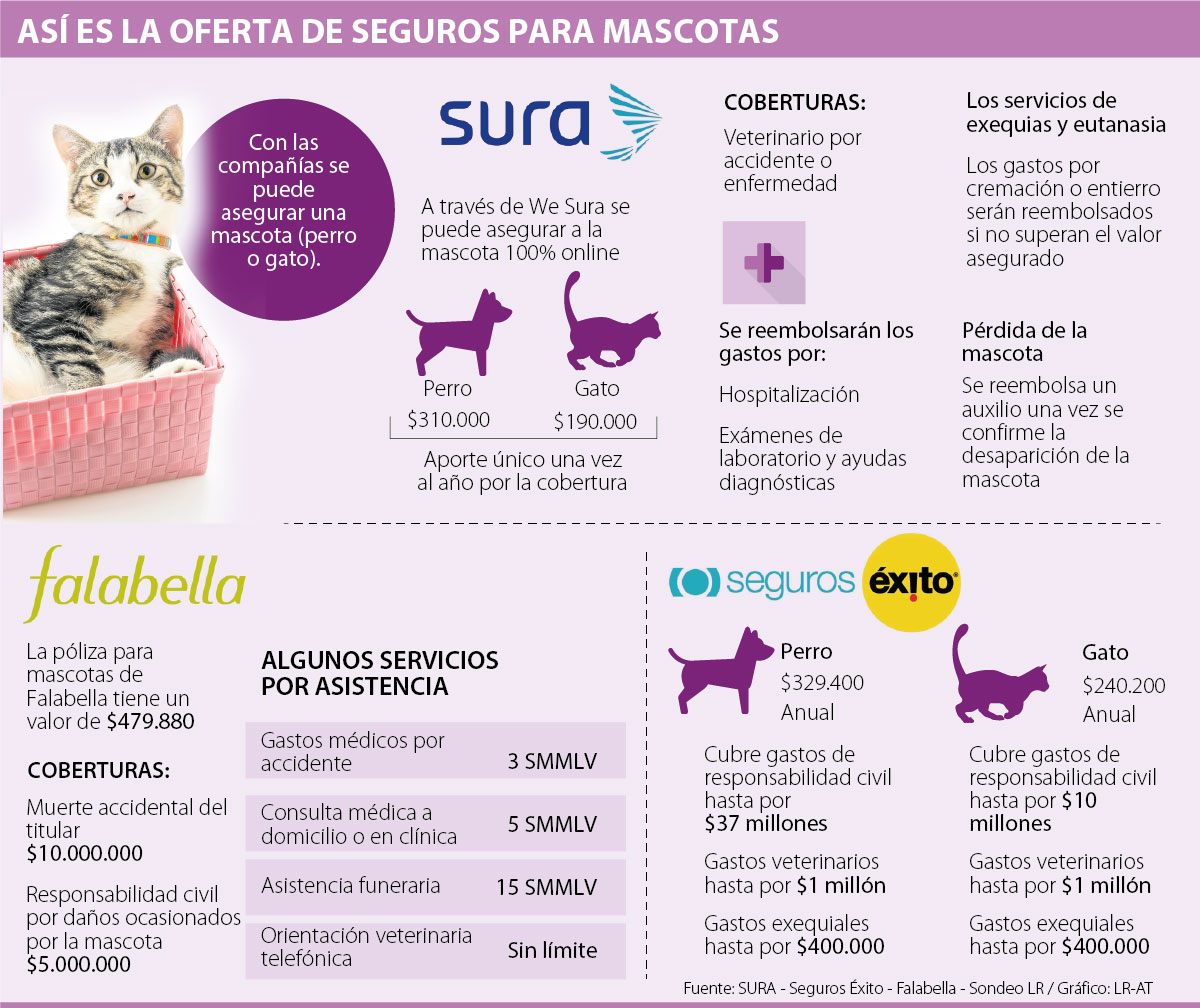 Las pólizas son una nueva línea de negocio para diferentes compañías aseguradoras del país, como es el caso de Sura, Allianz, Colpatria, Mapfre y Falabella, por mencionar algunas, que ofrecen diferentes servicios para asegurar actividades relacionadas con los animales.