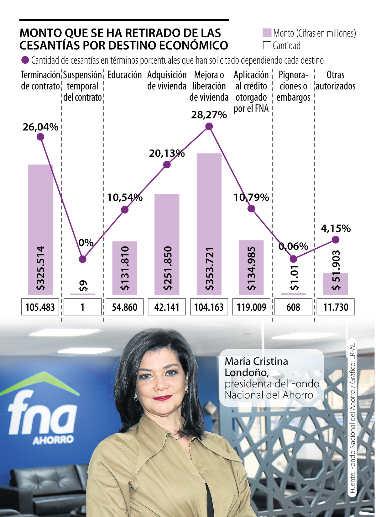 En lo corrido del año, cerca de 500.000 colombianos han retirado $1,25 billones del FNA por las razones que la ley tradicionalmente ha permitido y en orden descendente: mejora o liberación de vivienda, terminación de contrato, adquisición de vivienda, abono a crédito, educación, pignoraciones o embargos. Este comportamiento coincide con el evidenciado en 2019.