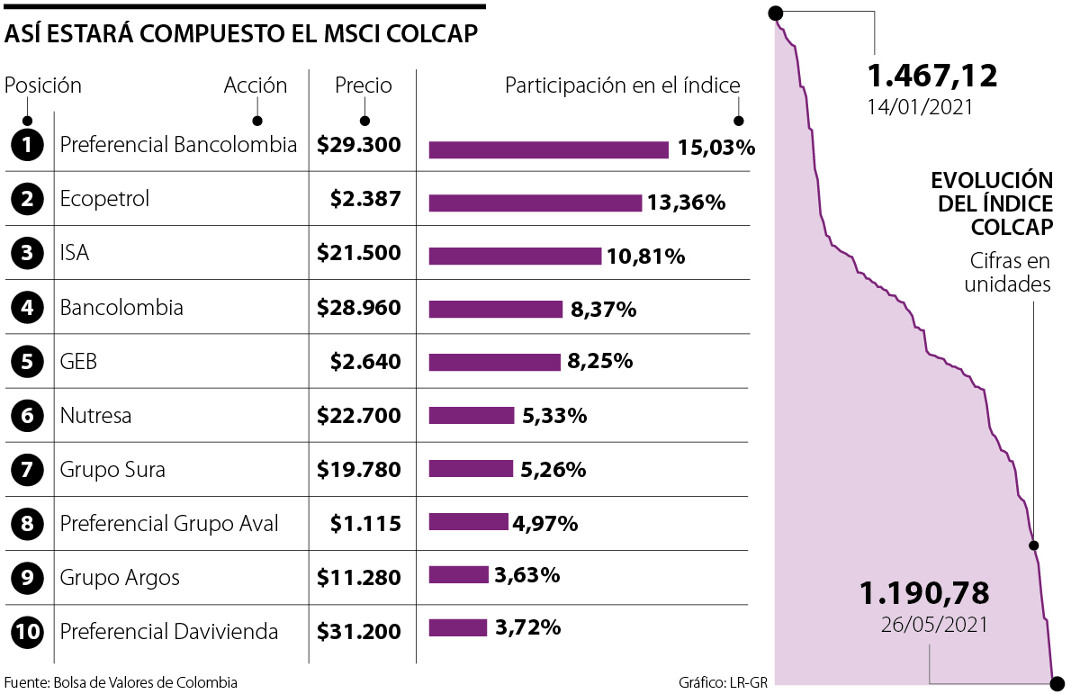 El Msci Colcap fue diseñado para generar mayores elementos de consistencia y transparencia en línea con las metodologías internacionales, por lo que fue determinado con base en información de capitalización de mercado al cierre del 14 de mayo de 2021. La información restante, incluyendo liquidez y flotante, seguirá las fechas de corte ya establecidas.