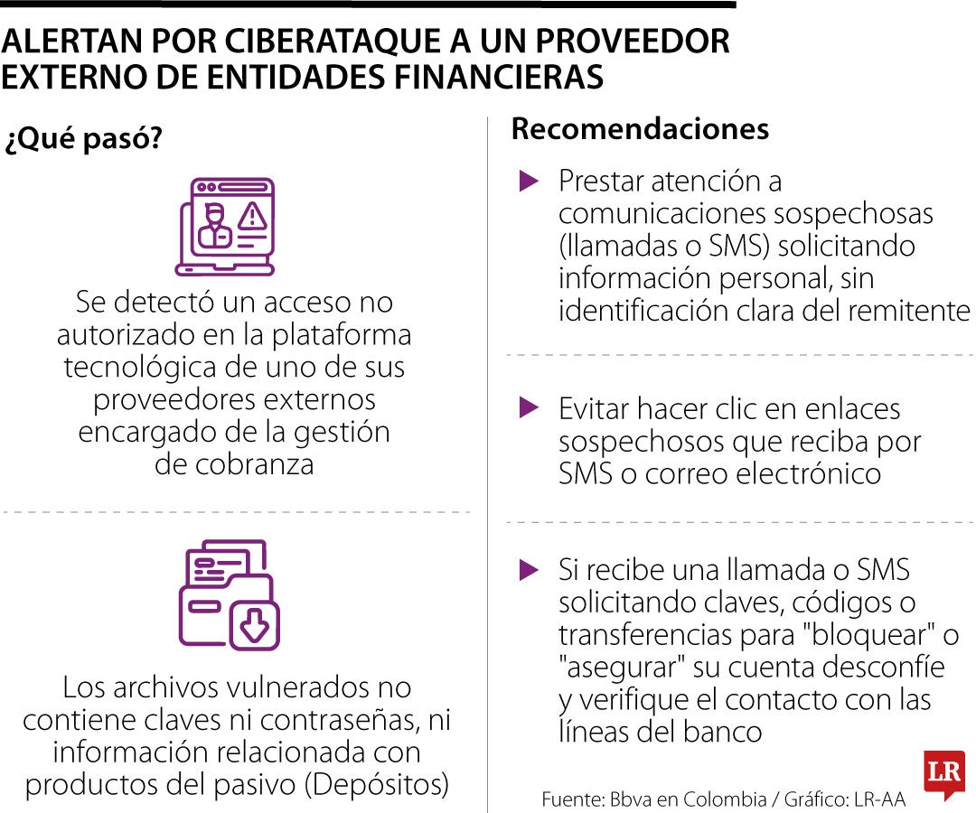 Los archivos vulnerados, tal como lo confirmó, contienen información de clientes como nombre, cédula y número telefónico. "Cabe resaltar que la información no contiene claves ni contraseñas, ni información relacionada con productos del pasivo (Depósitos), ya que el proveedor no tiene acceso a esta información confidencial", detalló Bbva.