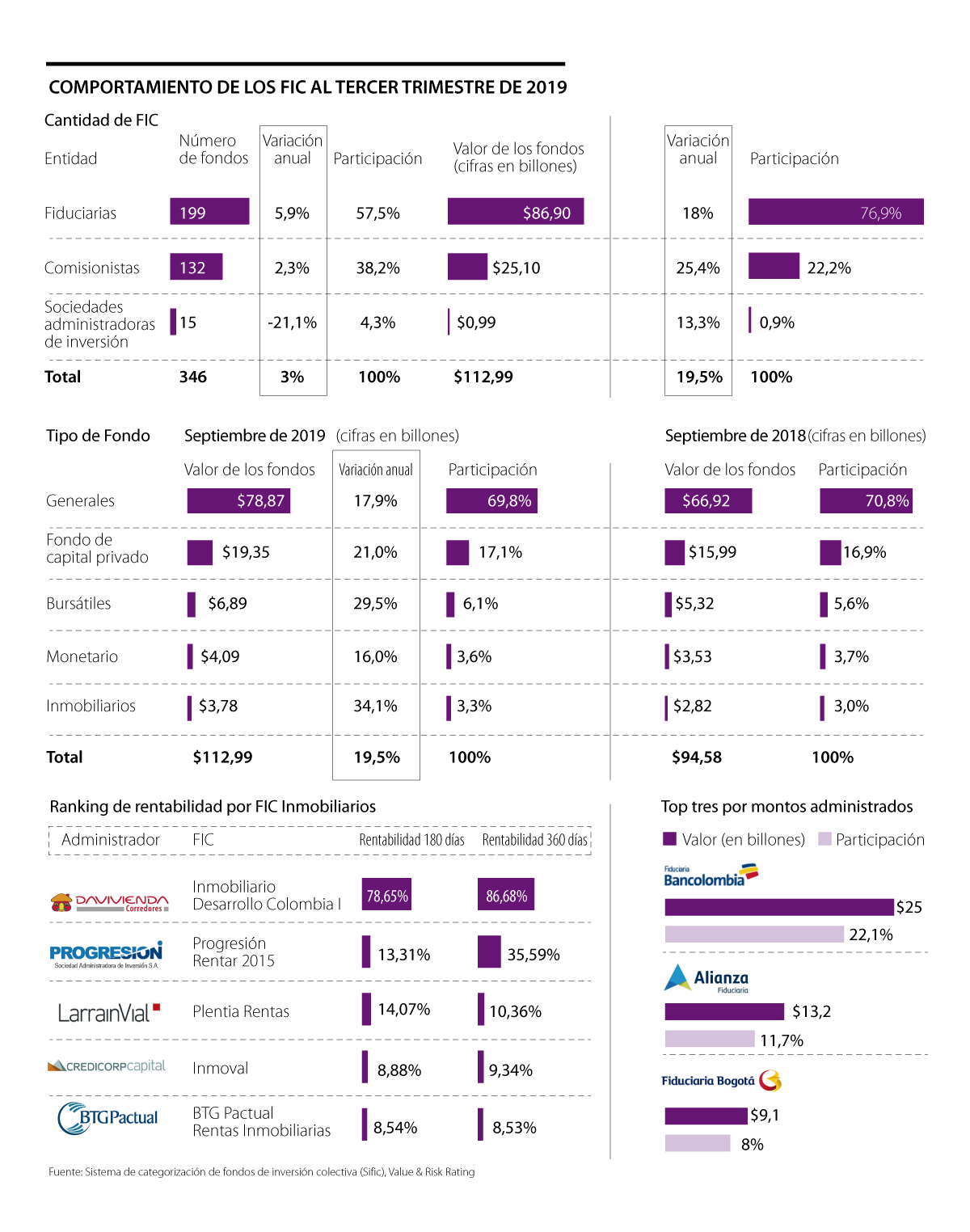 Entre septiembre de 2018 y septiembre de 2019, los recursos invertidos en FIC crecieron 19,5%, hasta $112,99 billones. De las entidades que manejan estos fondos, las fiduciarias son las que lideran por montos administrados, pues tienen 76,9% de los activos de este vehículo.