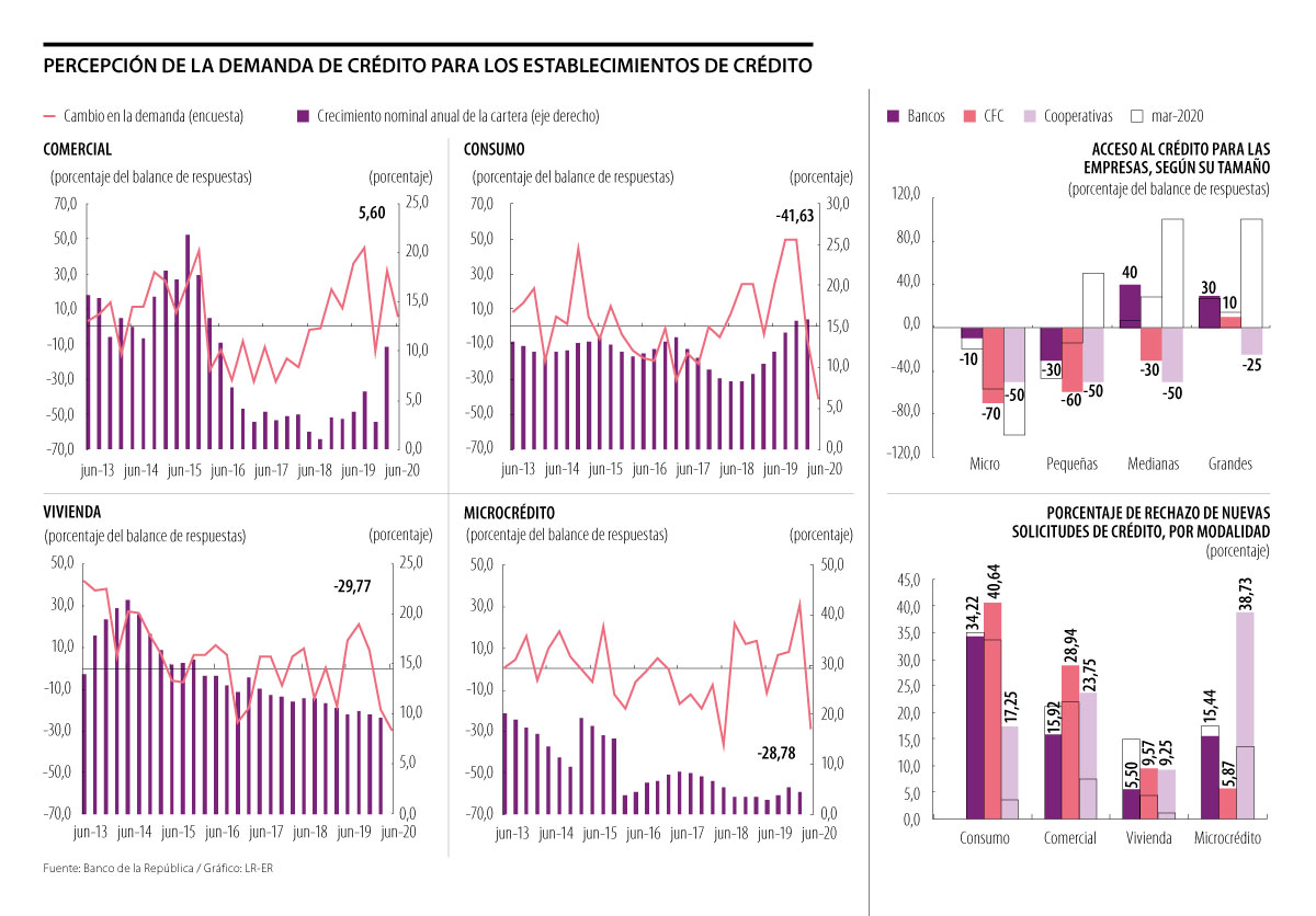 La cartera de microcrédito también cerró el segundo trimestre en terreno negativo con una caída de 28,78%, mientras que la percepción de la demanda de crédito comercial terminó el mismo periodo en 5,6%. A pesar de que continúa en terreno positivo, este nivel es muy bajo, citó el análisis del Banco de la República.
