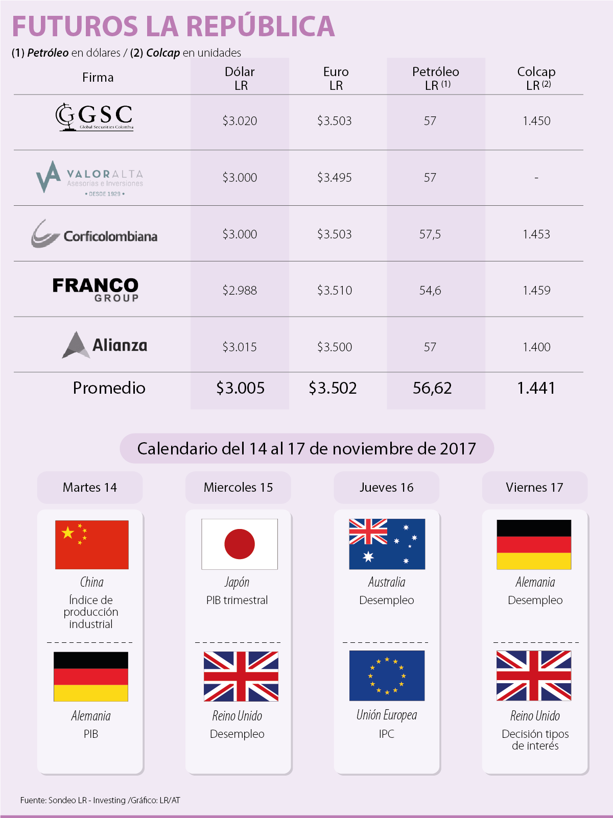 Por último, los expertos manifestaron que el índice Colcap de la BVC se mantendrá muy cerca de los 1.441 puntos, aunque esta semana empresas como el Grupo Éxito, Avianca y la ETB reportarán sus resultados del tercer trimestre, por lo que habrá que esperar qué tanto impacto tendrá, en el caso de la aerolínea, el paro de pilotos, subrayó Granados.