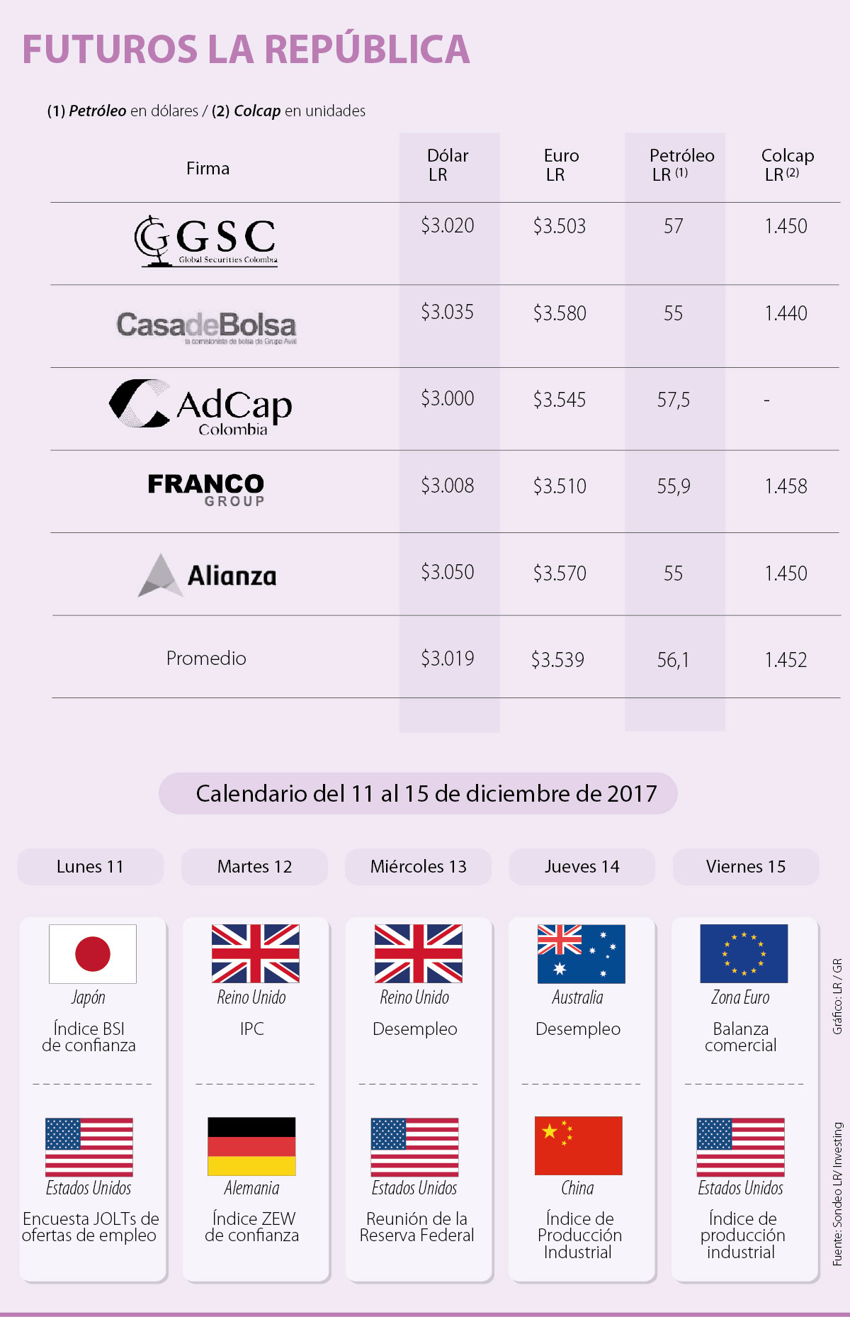 “Esta semana se conocerán las repercusiones que traigan los datos de empleo de EE.UU. y la última reunión de política monetaria de la Fed, en la cual esperamos exista un aumento de 25 puntos básicos, que, si siguen las alzas, implicaría un dólar fuerte para el 2018”, señaló Felipe Espitia, analista macroeconómico de Alianza Valores.
