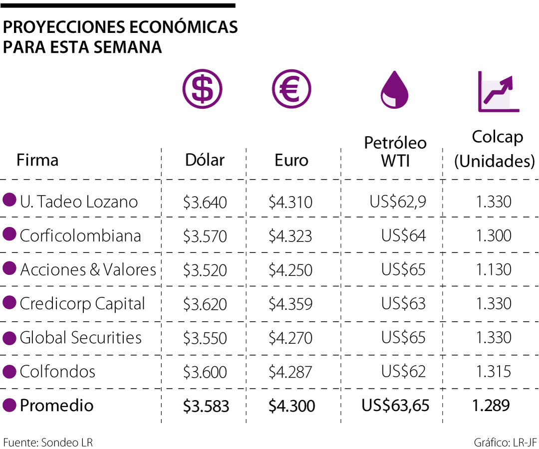 Los analistas proyectan que para esta semana el dólar se cotizará en un promedio de $3.583, mientras que prevén que el barril de petróleo WTI se ubique en US$63,65. También se espera que el euro se cotice a $4.300, mientras que el Colcap llegaría a 1.289 unidades.