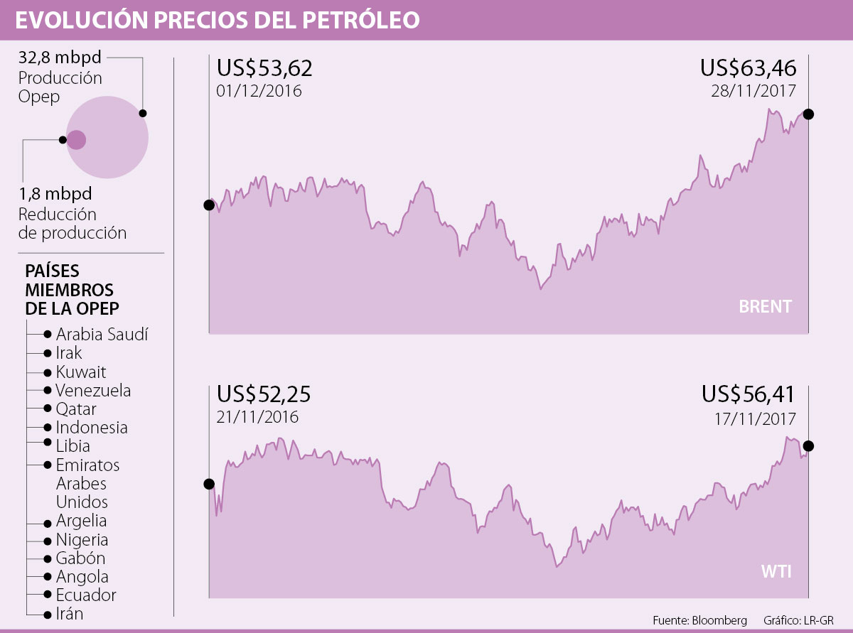 Luego de casi 12 meses desde que en Viena países como Arabia Saudí, Qatar, Nigeria y Kuwait, se pusieron de acuerdo para bajar la producción mundial de petróleo en casi 1,8 millones de barriles por día, el precio internacional de la materia prima ha subido desde US$46,38 por barril a US$63,46, es decir, US$17,08 o 36,8%.