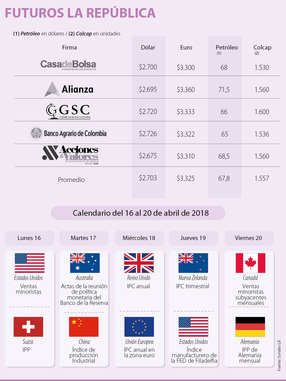 Según Natalia Granados, analista senior de Global Securities S.A, “aunque la tendencia sigue siendo a la baja, puede seguir oscilando durante esta semana entre el anterior nivel y la resistencia técnica que se ubica en $2.775”. Y agregó que “esta dinámica estuvo soportada por el avance del petróleo que se mantiene en niveles máximos de 2014 a pesar de un aumento en los inventarios de crudo publicados el miércoles (+3,3 millones de barriles)”.