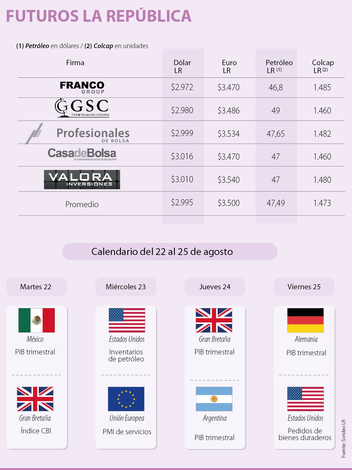 De acuerdo con información recolectada por LR, distintos analistas del sector pronostican un valor promedio del dólar de $2.995 para la semana que inicia. Hay que tener en cuenta que el valor obtenido se aleja menos de $1 con respecto al costo con el que cerró la divisa en la jornada del viernes pasado: $2.994,57.
