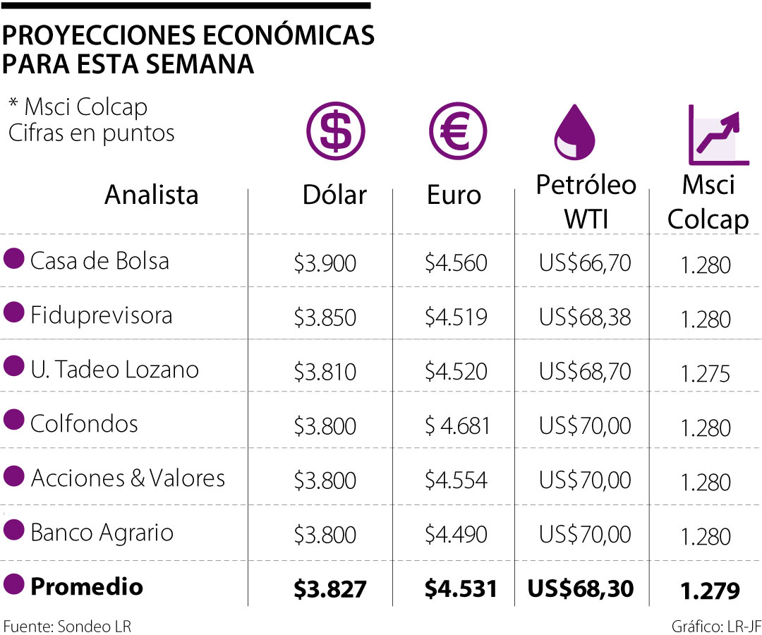 El euro llegará a $4.531 en promedio, mientras que el barril de petróleo WTI se situará a US$68,30 y el Msci Colcap en 1.279 puntos